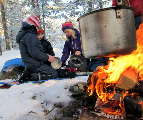Efter en lång dag och många äventyr är det skönt att få sätta sig ned kring lägerelden. Många längtar redan till tältet och den sköna sovsäcken.